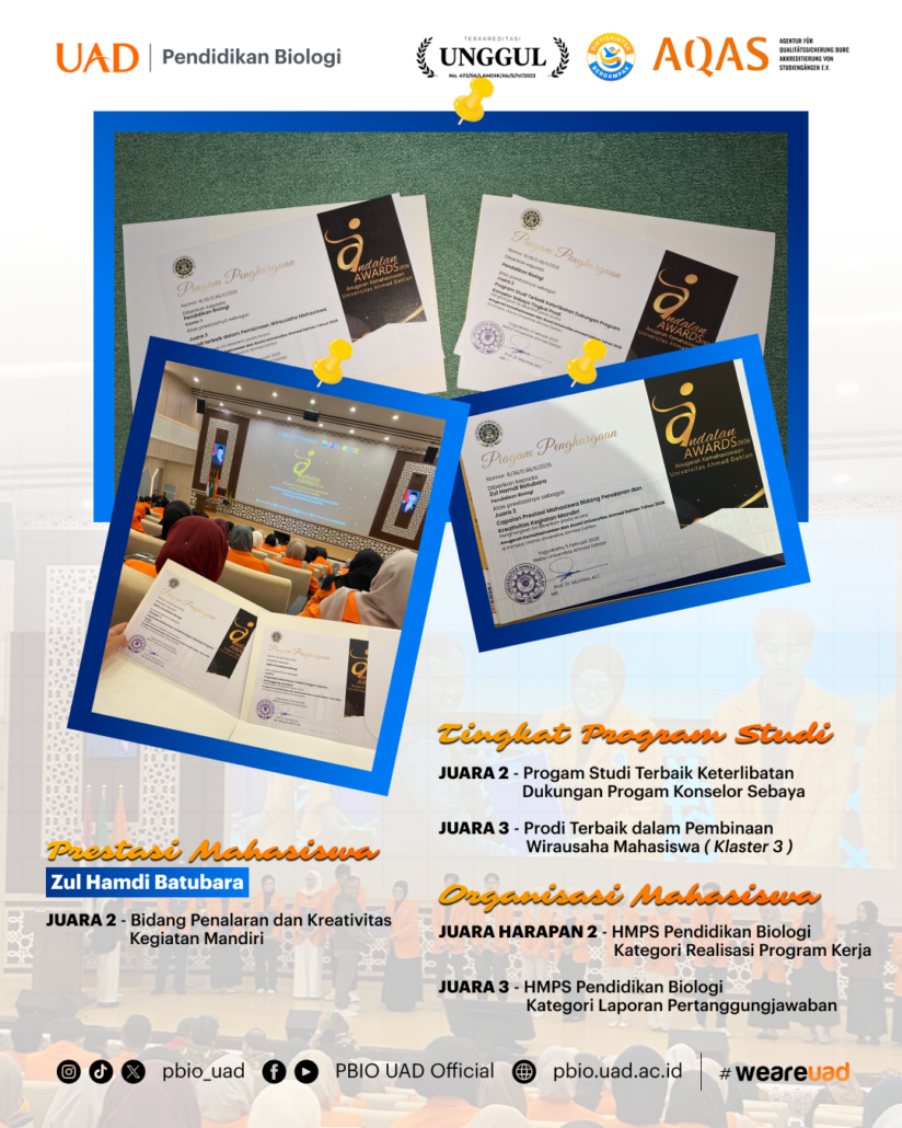 YOGYAKARTA, Program Studi Pendidikan Biologi (PBIO) Universitas Ahmad Dahlan (UAD) kembali menegaskan posisinya sebagai salah satu prodi paling progresif di lingkungan universitas. Dalam ajang bergengsi Andalan Awards 2026 yang digelar oleh Biro Kemahasiswaan dan Alumni (Bimawa) di Amphitarium Kampus 4 UAD (05/02), PBIO sukses memborong lima penghargaan di berbagai kategori strategis. Penghargaan ini menjadi pengakuan atas dedikasi prodi dalam menciptakan ekosistem pendidikan yang seimbang antara keunggulan akademik, kewirausahaan, dan manajemen organisasi.
